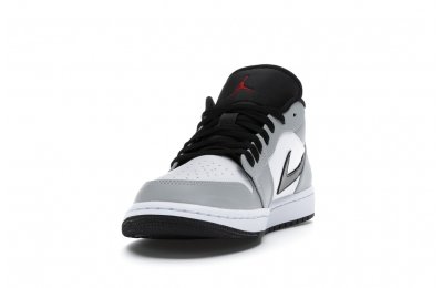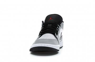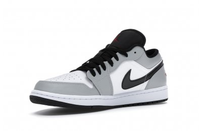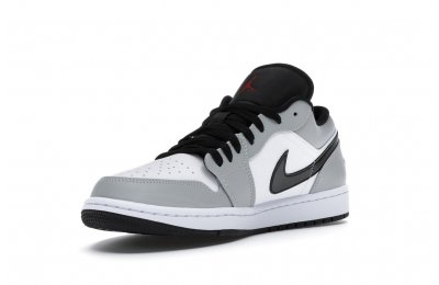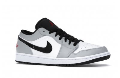 The Air Jordan 1 Low Light Smoke Grey features a white leather upper, overlaid with grey at the heel and toe. Black laces, liners, and Swooshes give these kicks a distinct look, as do the outsole, collar, and tongue. Hits of red, black, and white are prominent in the design’s accompanying details. A white midsole and black outsole completes this retro design.