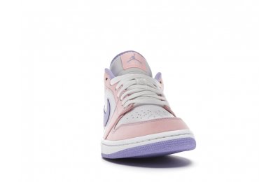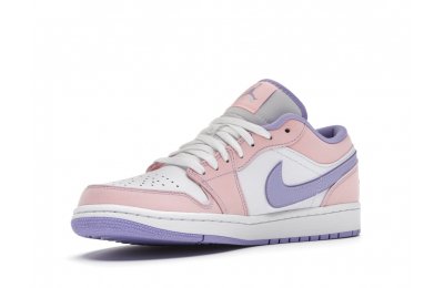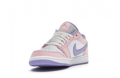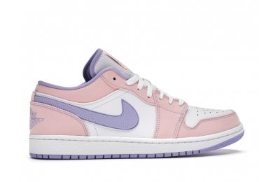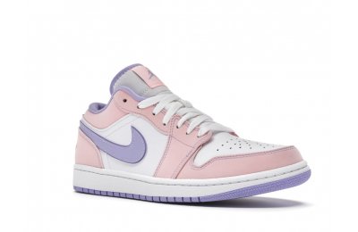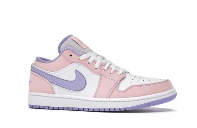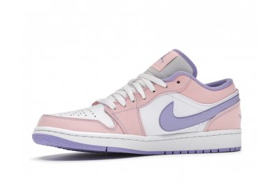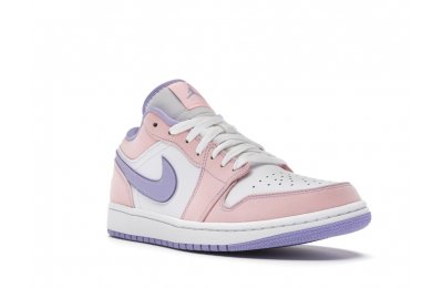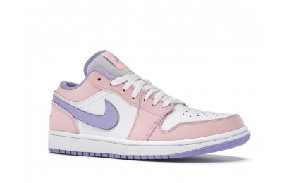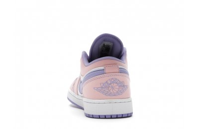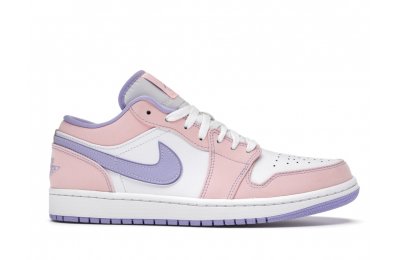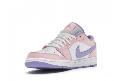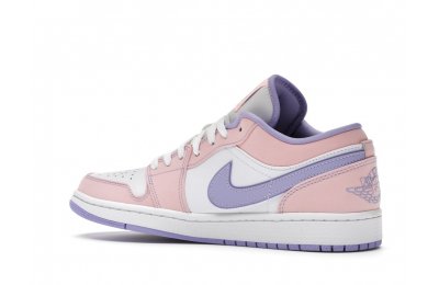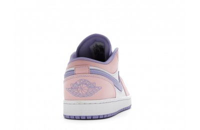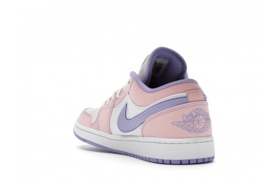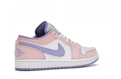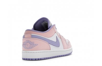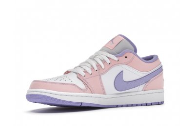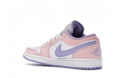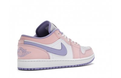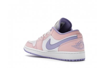 The sleek white base of the all-leather upper is complemented by supple pink overlays on the medial side, mudguard, and a lilac Nike Swoosh. The latter shade is echoed on the Wings emblem stitched on the heel and a Jumpman icon on the tongue tag. An encapsulated Air sole unit is tucked under the heel, and an EVA wedge is in the rubber cup sole for cushioning.