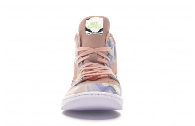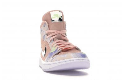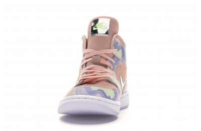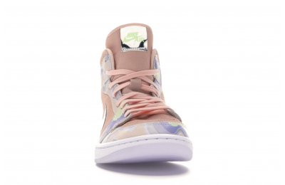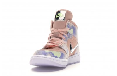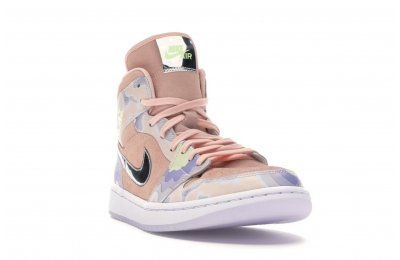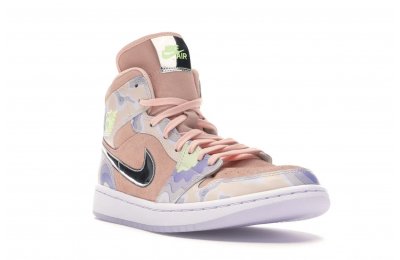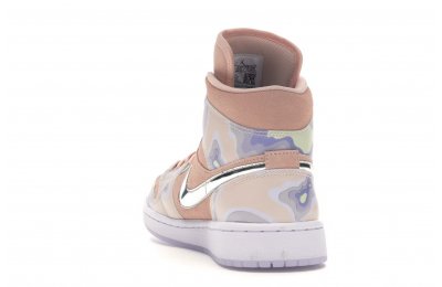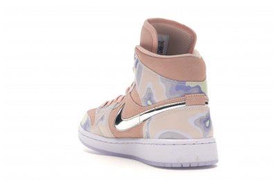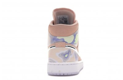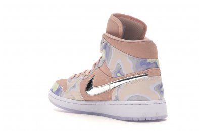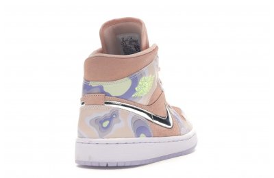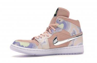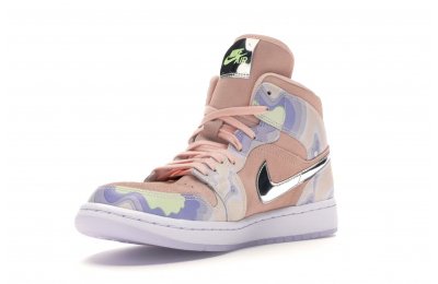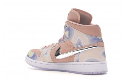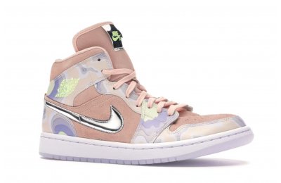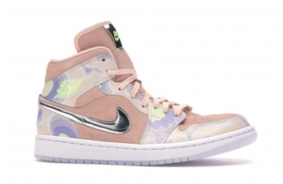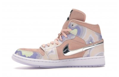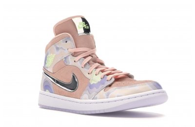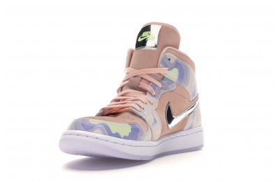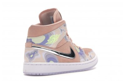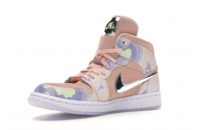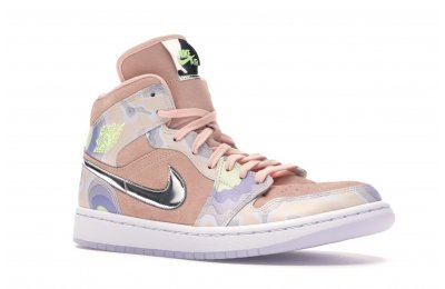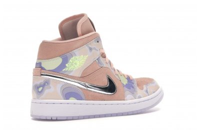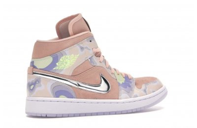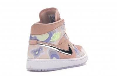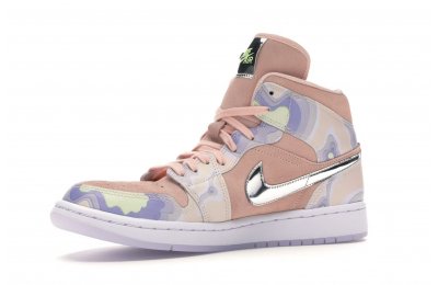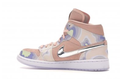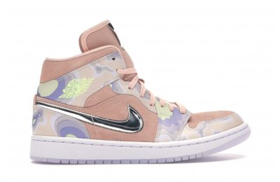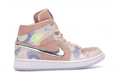 The women’s Air Jordan 1 Mid SE P(HER)SPECTIVE features a suede upper in a pastel Washed Coral finish. Shiny chrome detailing stands out on the signature Swoosh and Nike-branded tongue tag, while wavy multi-hued formations cover the leather overlays for a dreamy aesthetic. The mid-top rides on an Air-infused white foam midsole, reinforced underfoot by a semi-translucent rubber outsole tinted purple.