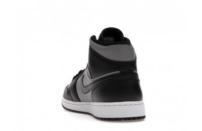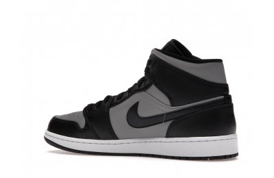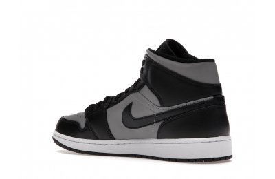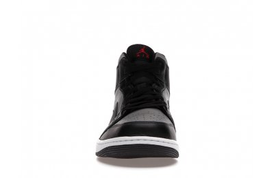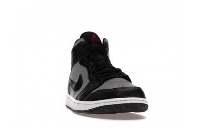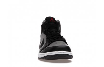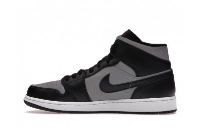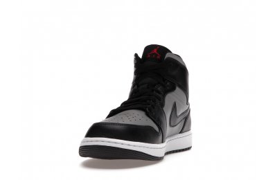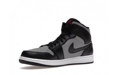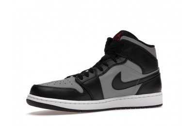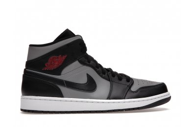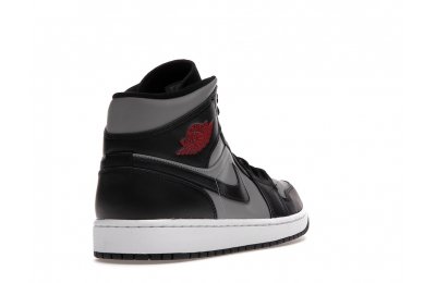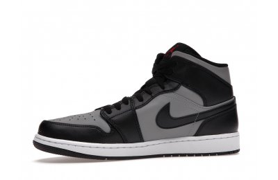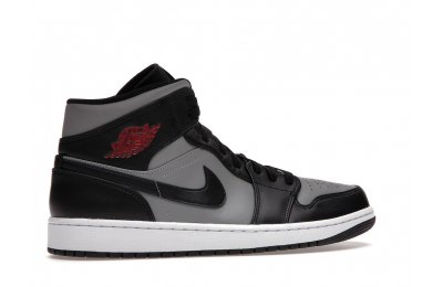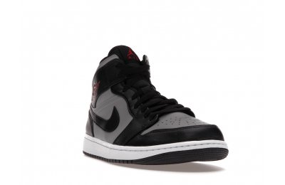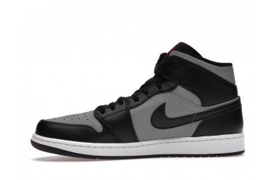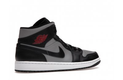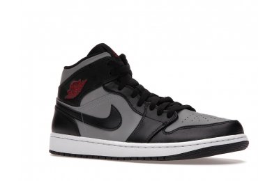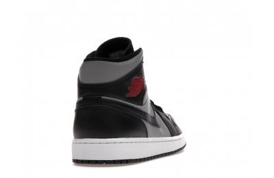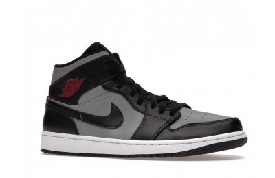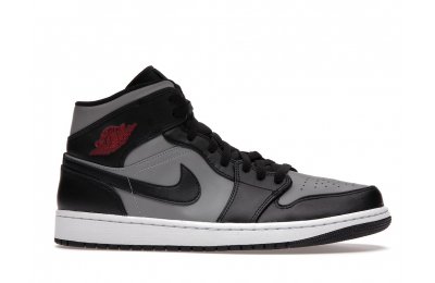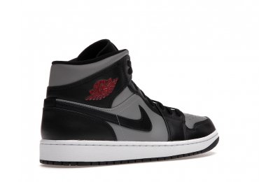The Jordan 1 Mid Shadow Red features a grey smooth leather upper with black overlays and Swooshes. At the collar, a debossed red Air Jordan Wings logo nods to the original Air Jordan 1 design. From there, a woven Jumpman tongue tag, white midsole, and black outsole complete the design.