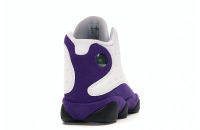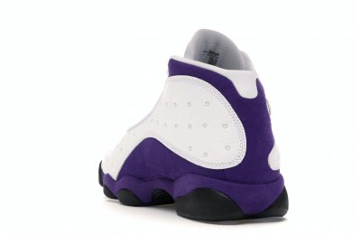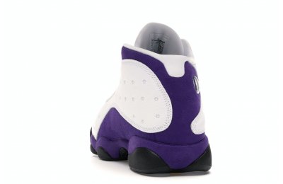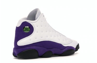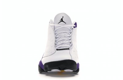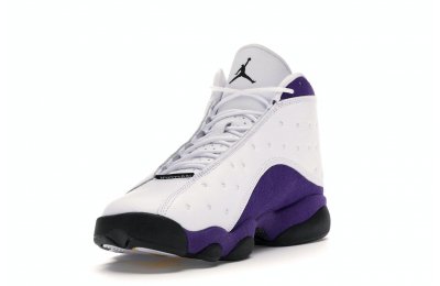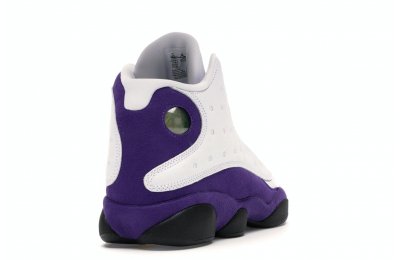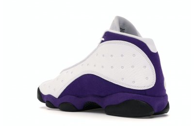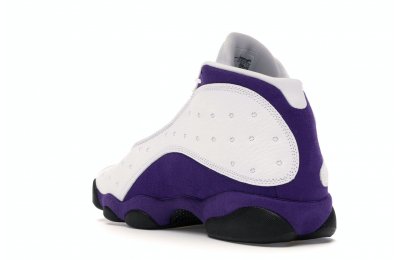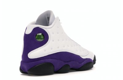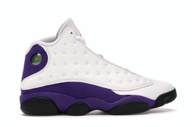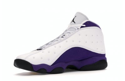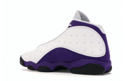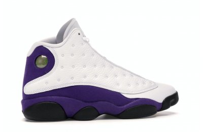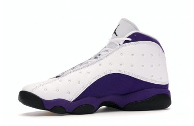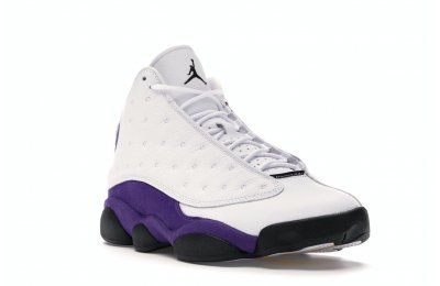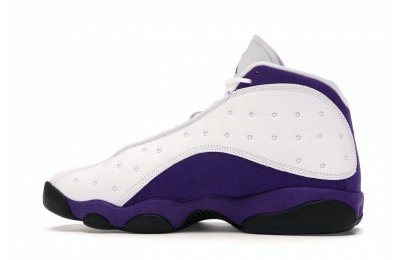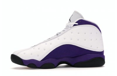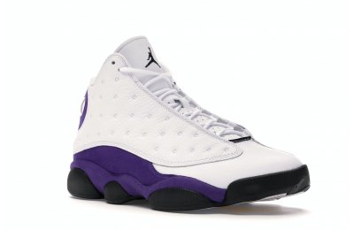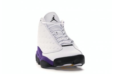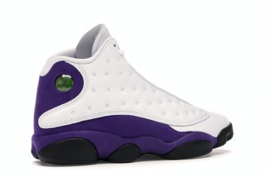 The Air Jordan 13 Retro Lakers has become a celebrated version that pays homage to the 1990–1991 NBA Finals in which Michael Jordan won his first championship by defeating the Los Angeles Lakers.The Los Angeles Lakers' colors are used in the color scheme to spice up Jordan's 13th signature. The upper is made of white tumbled leather, while the mudguard and heel are wrapped in purple suede as an accent. The design of these Retro Lakers sneakers is completed by a lateral heel-mounted hologram and a purple Jumpman sewn on the tongue. A black rubber outsole supports it.