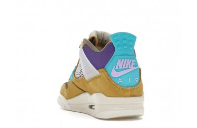 The Air Jordan 4 Union LA Desert Moss features a Dark Iris mesh upper with Desert Moss suede overlays and translucent lace loops. From there, turquoise heel tabs and Union LA woven tabs on the lateral side complete the design.