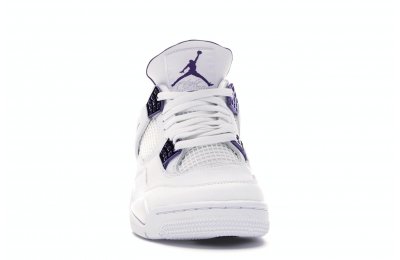 This Jordan 4 features a white leather upper with white netted underlays and Metallic Purple detailing on the upper eyelets. A Metallic Purple Jumpman logo on the heel, white sole, and Metallic Purple Air bubble complete the design.