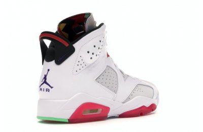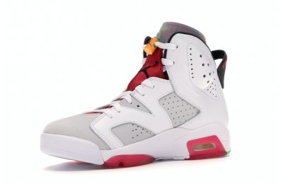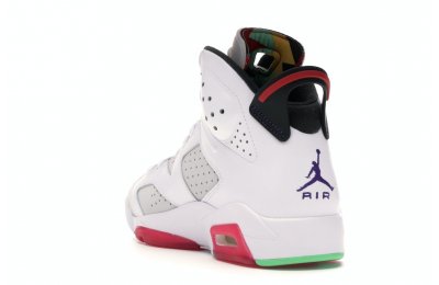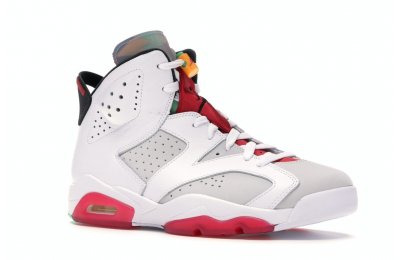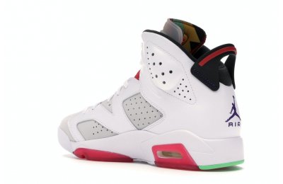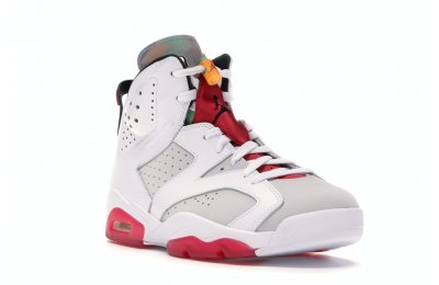 This Jordan 6 consists of a white leather upper with grey underlays and a red detailing. A translucent tongue, patterned outsole, and a purple Jumpman on the heel complete the design.