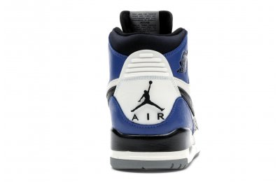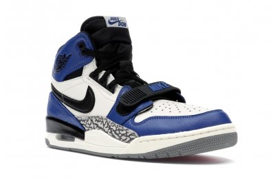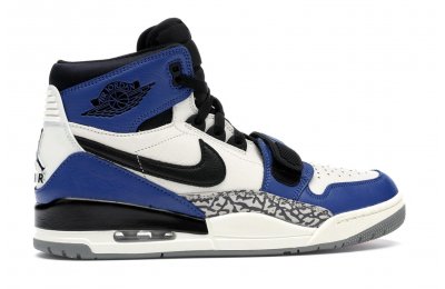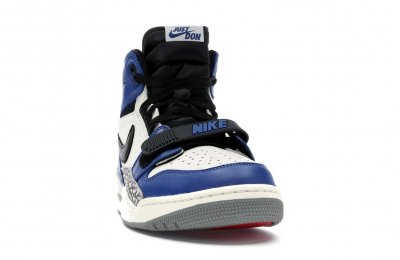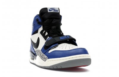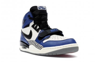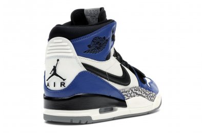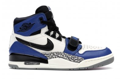 The Jordan Legacy 312 represents one of the most anticipated lifestyle models from Jordan Brand in 2018. A hybrid model, the 312 combines elements of the Air Jordan 1, Nike Air Alpha Force 2, and Air Jordan 3. Well known for his Just Don clothing line, Don C is the mastmind behind the Jordan Legacy 312. This particular colorway uses colorblocking similar to the "Game Royal" Jordan 1s, using white, blue, and black leather on the upper, hits of elephant print on the side panels, and a white Nike swoosh.
