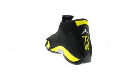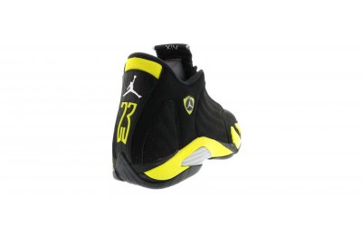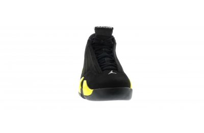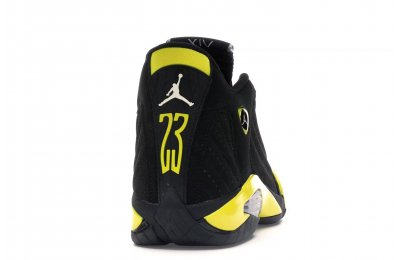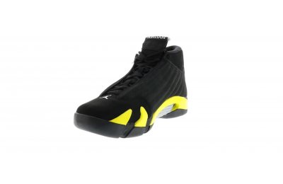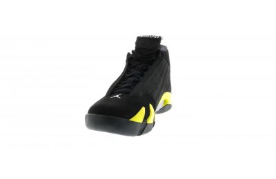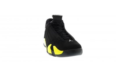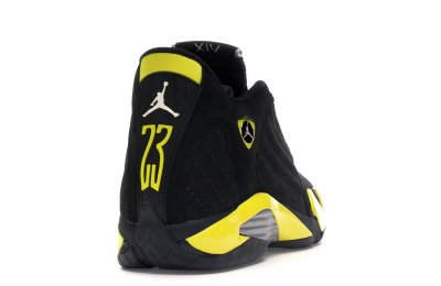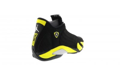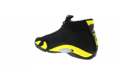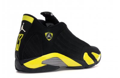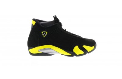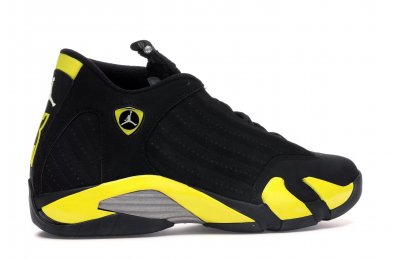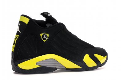 Notably absent since 2012, the Air Jordan 14 returned to shelves in 2014 in four colorways, the 'Sport Blue,' 'Ferrari,' 'Black Toe,' and 'Thunder.' Taking a cue from the Air Jordan 4 'Thunder,' the Air Jordan 14 Retro 'Thunder' release sees a primarily black suede upper with yellow accents on the midsole and branding.