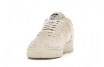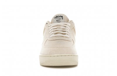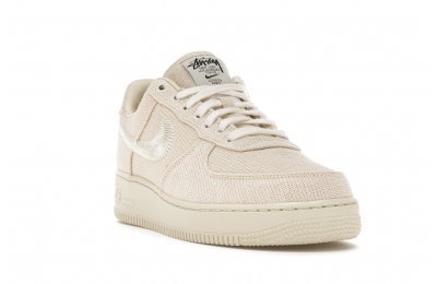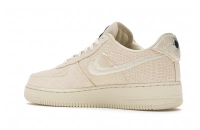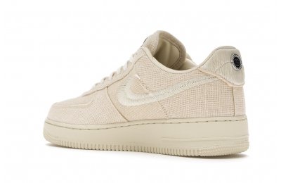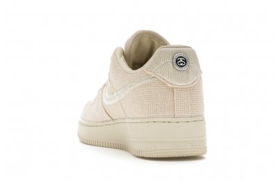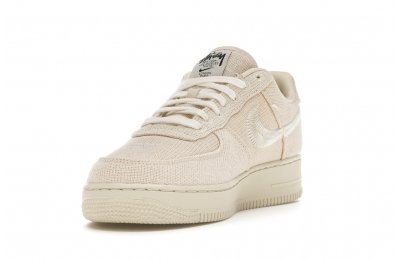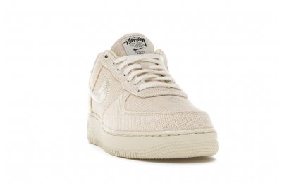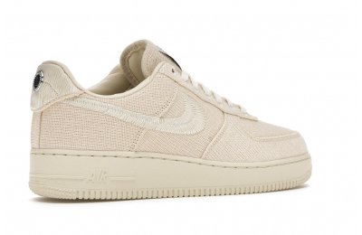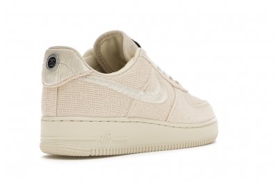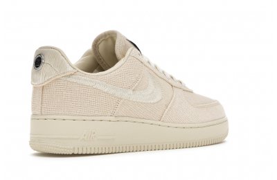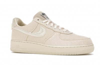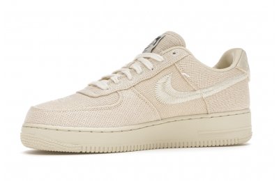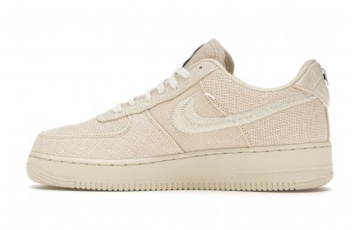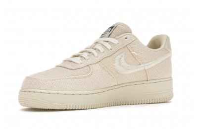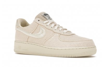 The Nike Air Force 1 Low Stüssy Fossil Stone features a hemp-like woven upper with heavily embroidered Swooshes and an alternate, long-haired textile on the heel tabs. Leather interiors, dual-branded tongue tags, and a Stüssy double "S" logo embroidered on the toe box finalize this re-iterated classic.