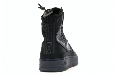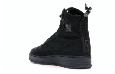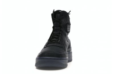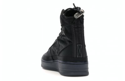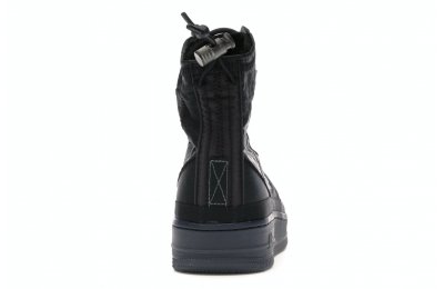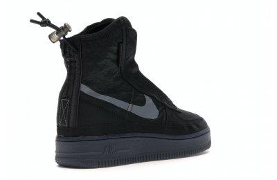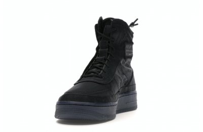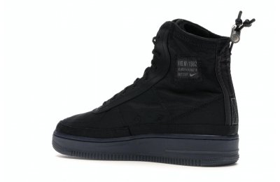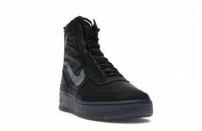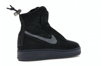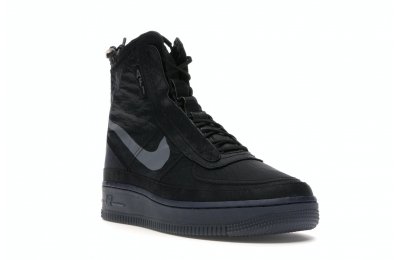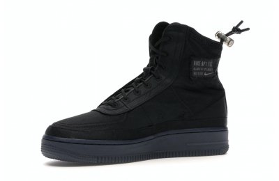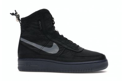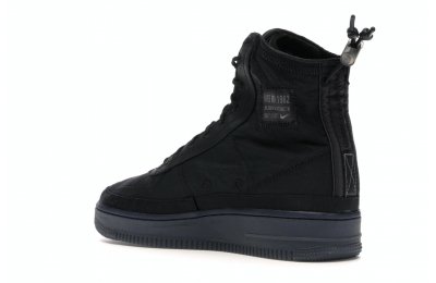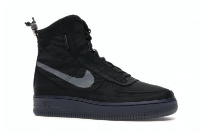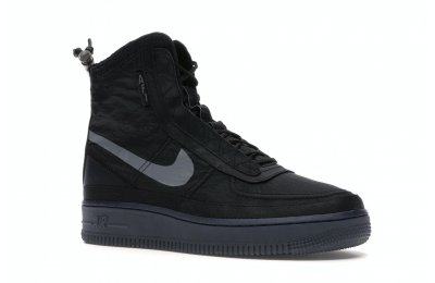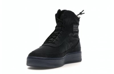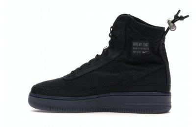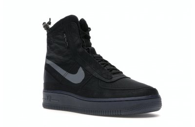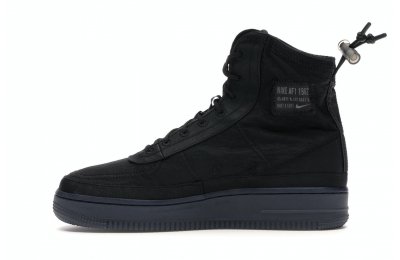 Triple black Air Force 1 Shell high-top shoes from Nike highlighting a mark Nike swoosh aside, an elastic sole, a ribbon in advance attaching, a drawstring affixing and a round toe.