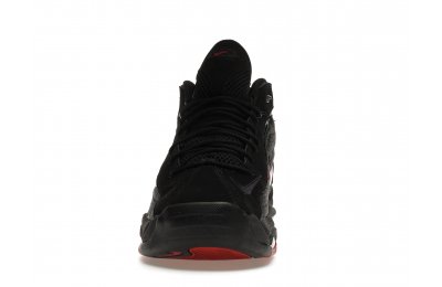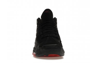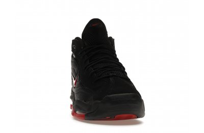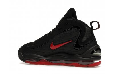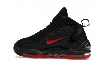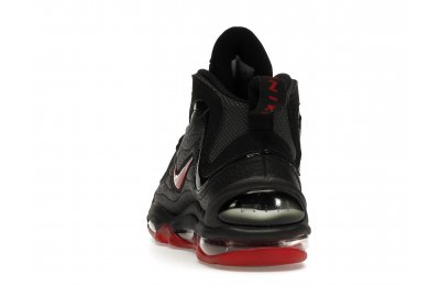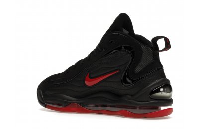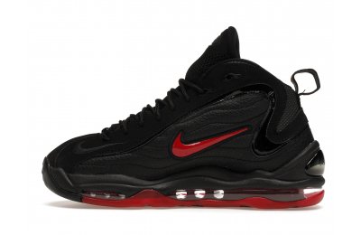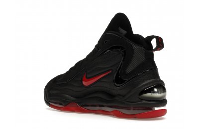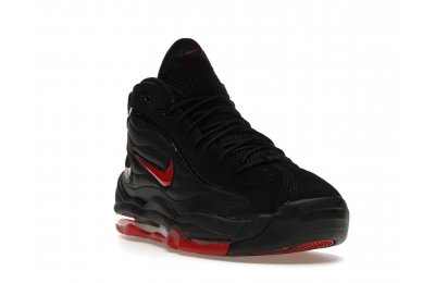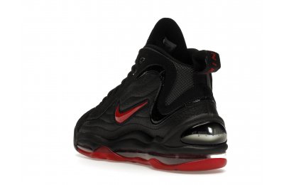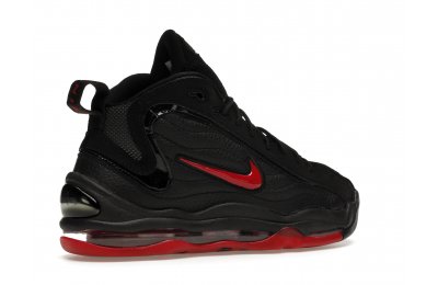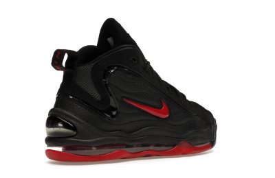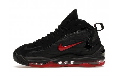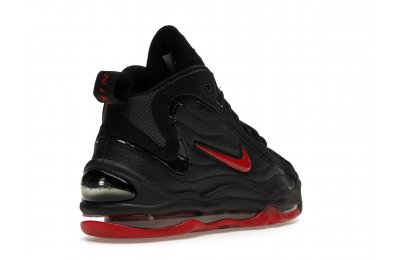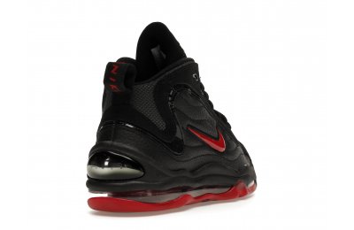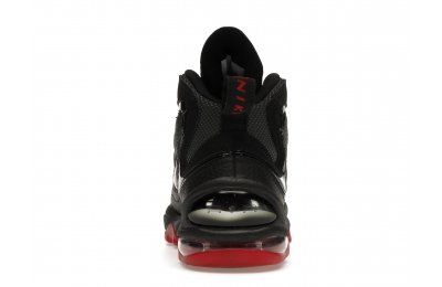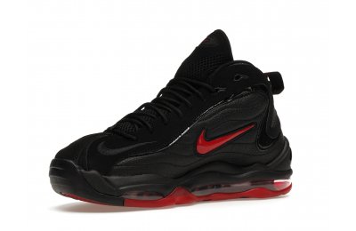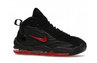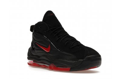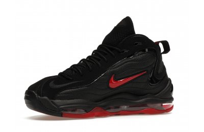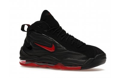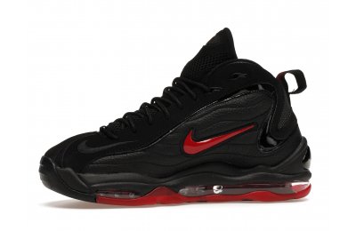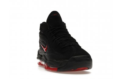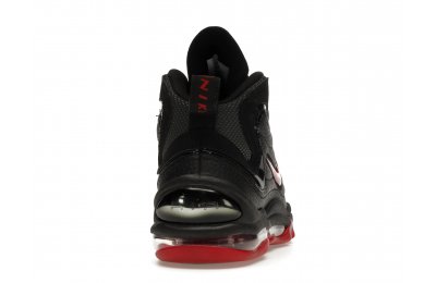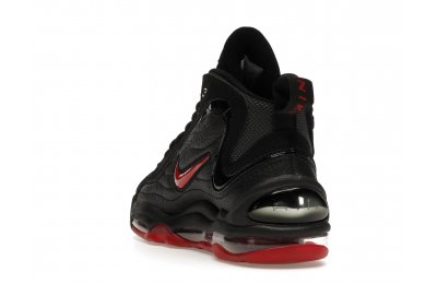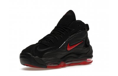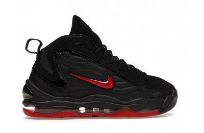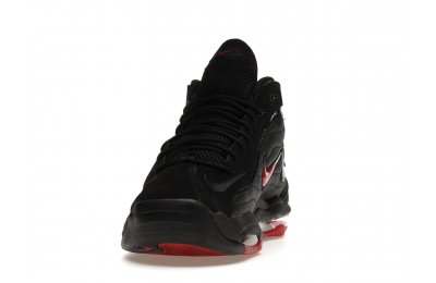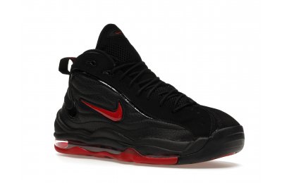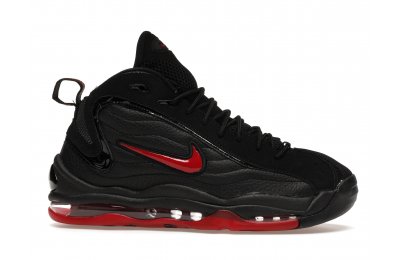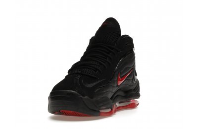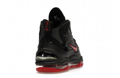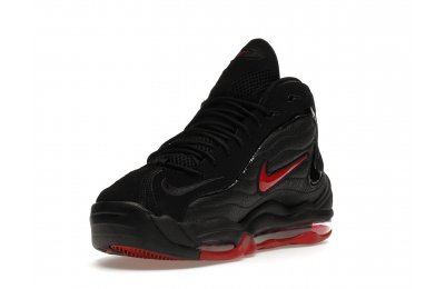 The Nike Air Total Max Uptempo ‘Bred’ brings back a vintage hoops shoe originally released in 1997. The materials and color blocking mirror the OG Black/Volt colorway, with the older shoe’s neon accents replaced by University Red. The upper combines black tumbled leather with tonal nubuck overlays, patent leather trim, mesh construction around the collar and a mirror-reflective insert embedded in the heel. The mid-top rides on a Phylon midsole, enhanced with a red-tinged full-length Max Air unit.