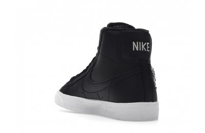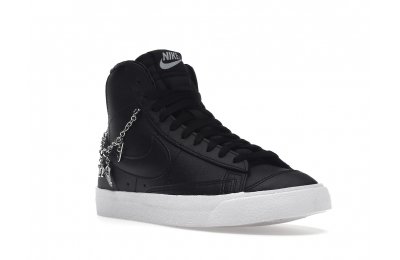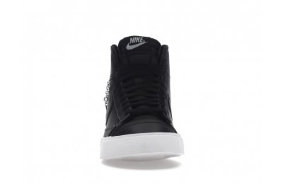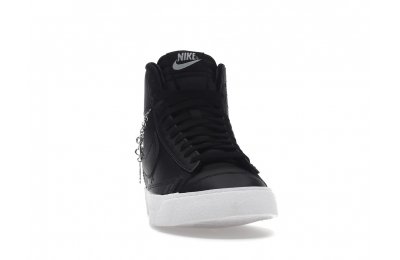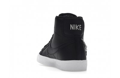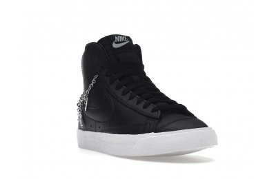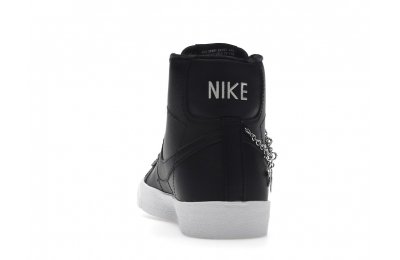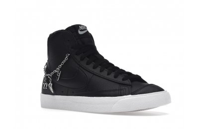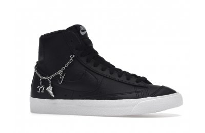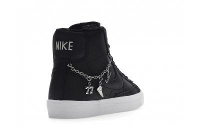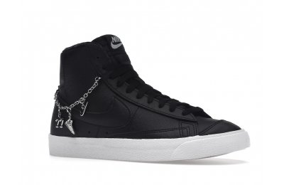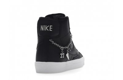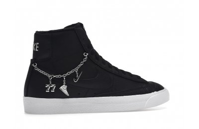 The Nike women’s Blazer Mid ‘77 LX ‘Lucky Charms Black’ accessorizes the vintage hoops shoe with custom hardware. A monochrome black finish is executed on the leather upper, lined in plush velvet and accented with silver Nike branding hits at the woven tongue tag and heel tab. Draped across the collar, a removable metallic silver chain features a trio of matching silver pendants. The sneaker rests on a textured white rubber midsole, supported underfoot by a herringbone-traction rubber outsole.