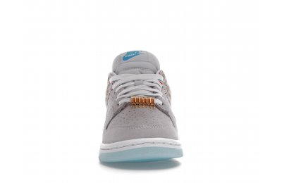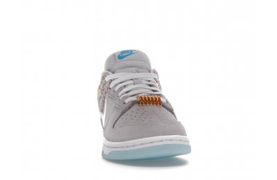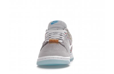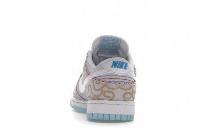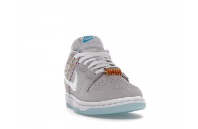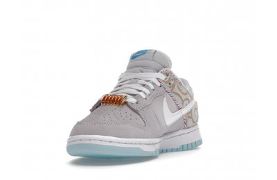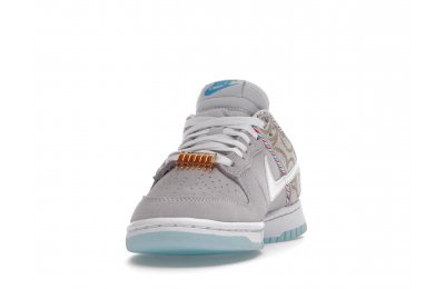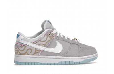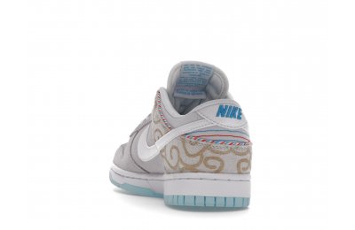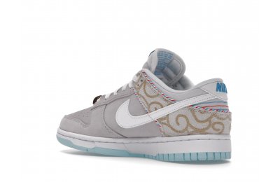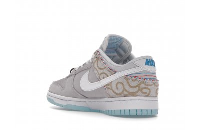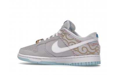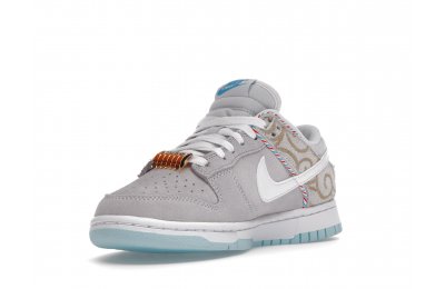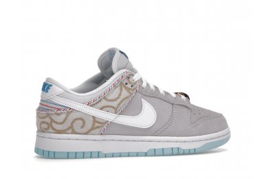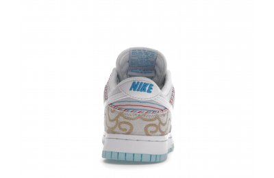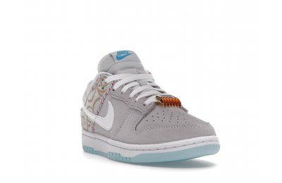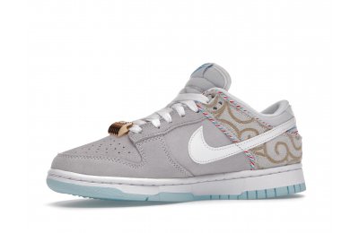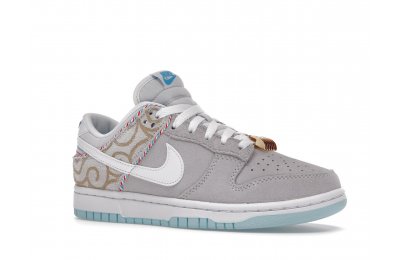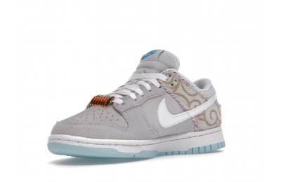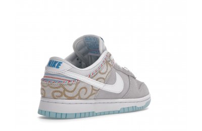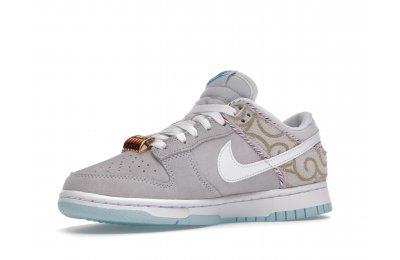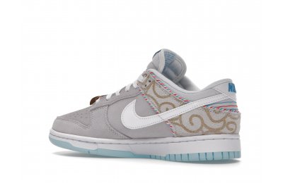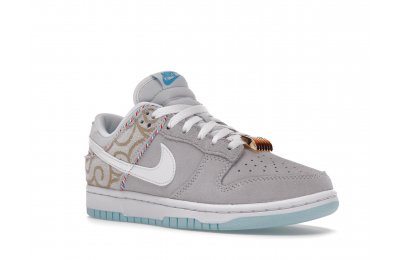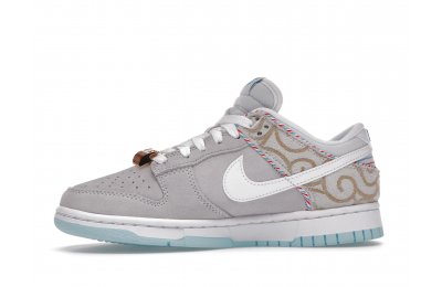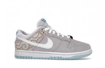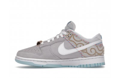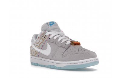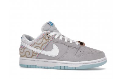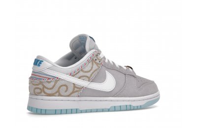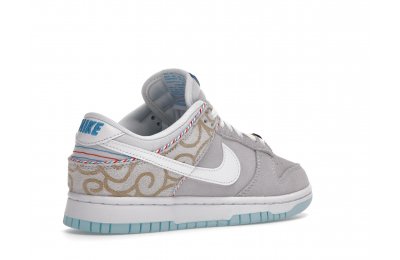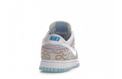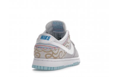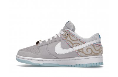 The Nike Dunk Low LE Barbershop Grey features a light grey suede upper with beige patterned collar overlays and a white textile Swoosh. Red and blue striped detailing along the overlays and heels nod to classic Barbershop poles. At the base, a white and light blue Air sole completes the design.