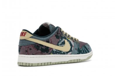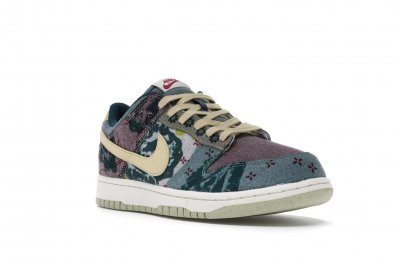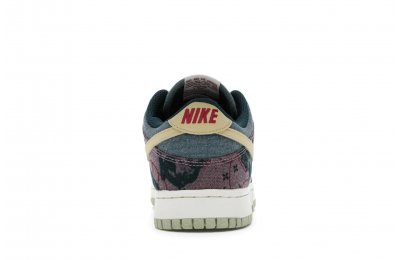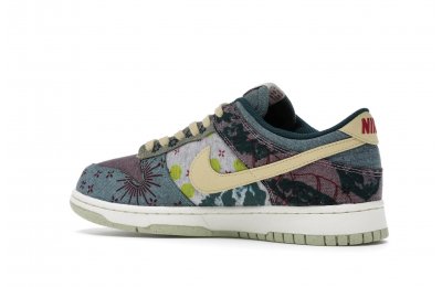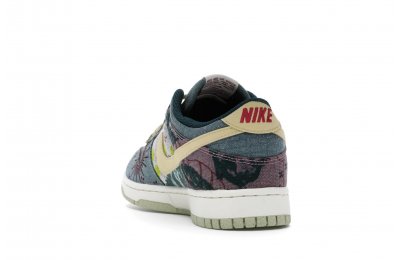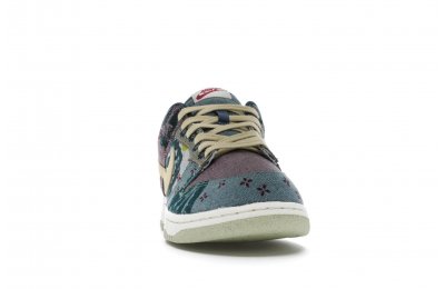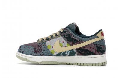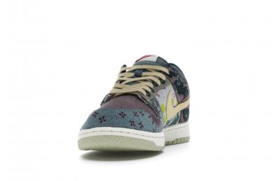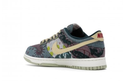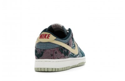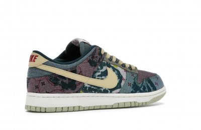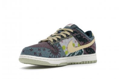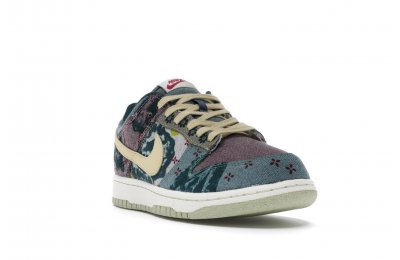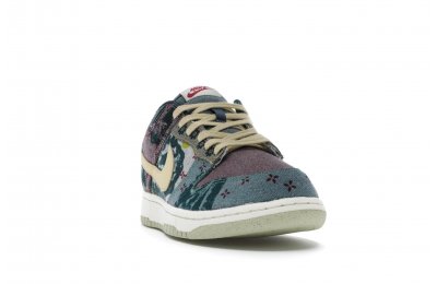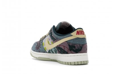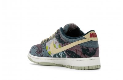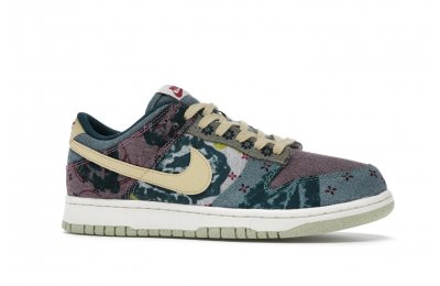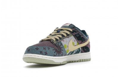 The Nike Dunk Low Community Garden features a dyed and printed patchworked canvas upper with hits of red, teal, and gold on the toe box, Swoosh, and heel tab. The design’s patchwork graphics are applied in a random pattern so that each pair appears as a one-of-one. A white midsole and Grind Rubber outsole, which is primarily featured in the Space Hippie collection, add the finishing touches.