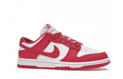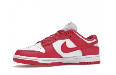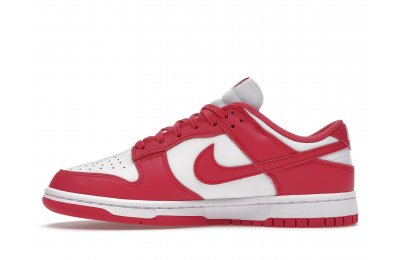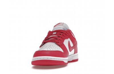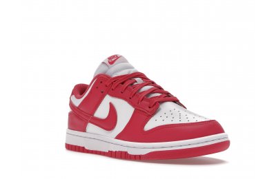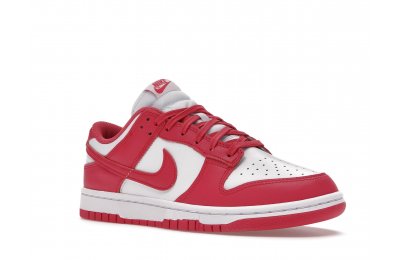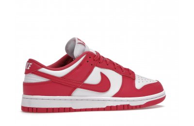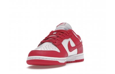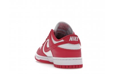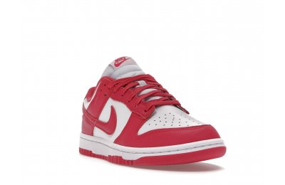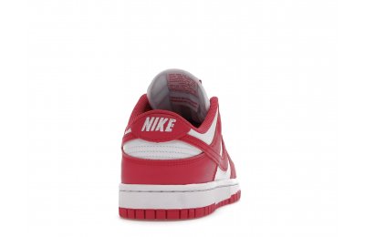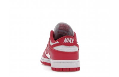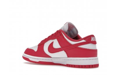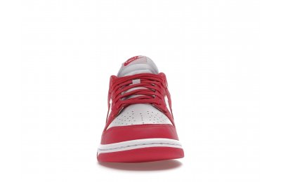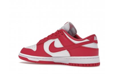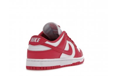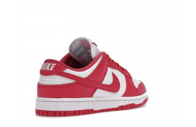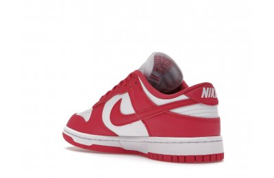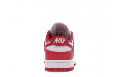 The women's Nike Dunk Low Next Nature White Gym Red (W) features a white Flyleather upper with Gym Red overlays and Swooshes. From there, matching soles and woven tongue labels add the finishing touch.