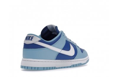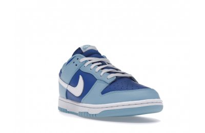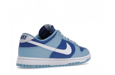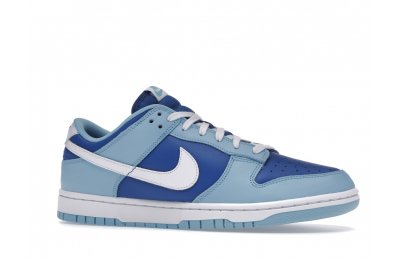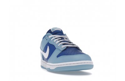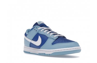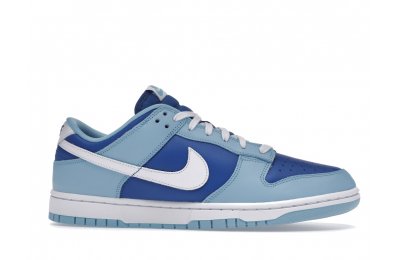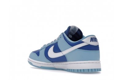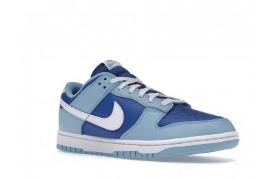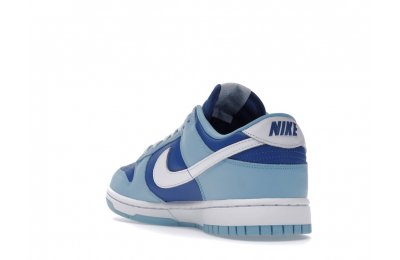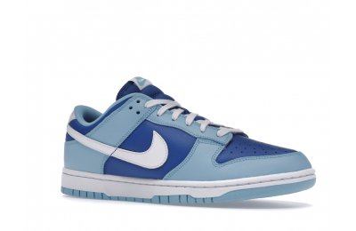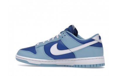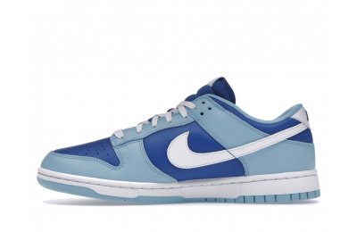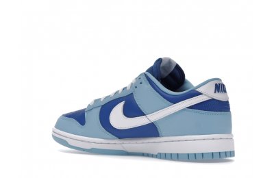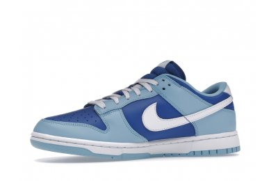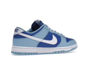 The Nike Dunk Low Retro QS Flash White Argon Blue Flash features a smooth leather upper that combines a marine blue foundation with powder blue overlays and a crisp white Swoosh.