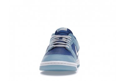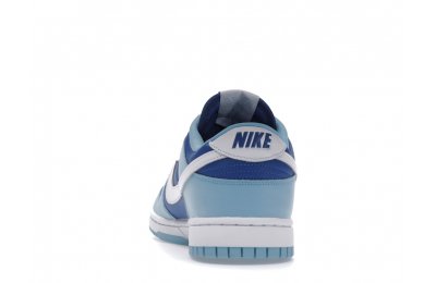 This Low Retro QS Nike Dunk has a woven Nike tag on the breathable nylon tongue, while the white leather back tab displays a Nike wordmark in slanted block lettering. The sneaker rests on a standard rubber cupsole, featuring white sidewalls and a pastel blue outsole.