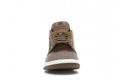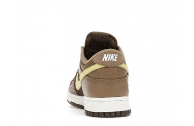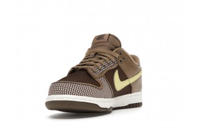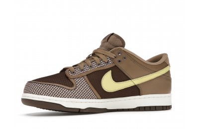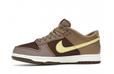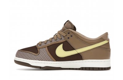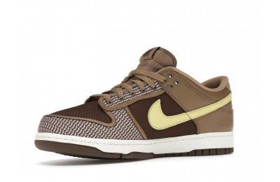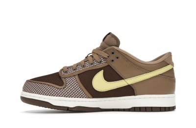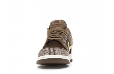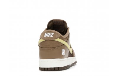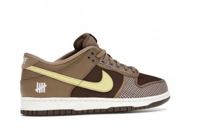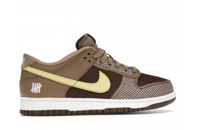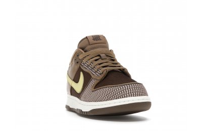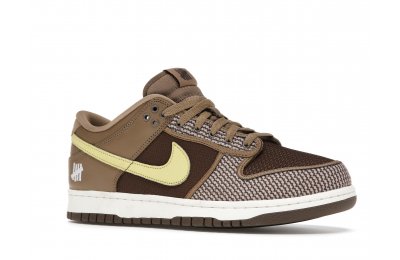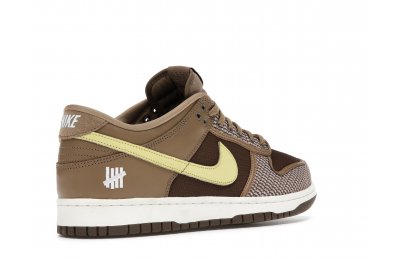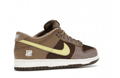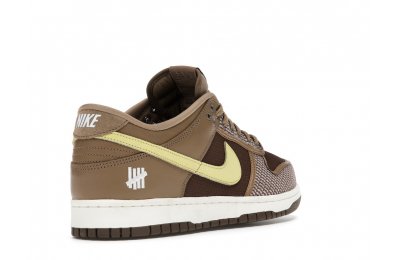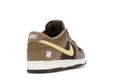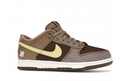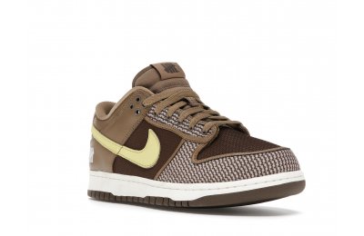 The Nike Dunk Low SP UNDEFEATED Canteen features a Canteen canvas and leather upper with a Palomino canvas toe wrap and eyestay. Lemon Frost leather Swooshes and UNDEFEATED tally mark insignias on the tongue, heel tab, and lateral heel complete the design.