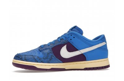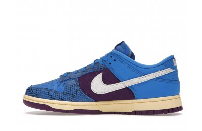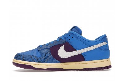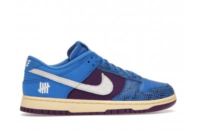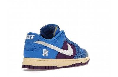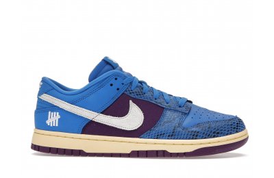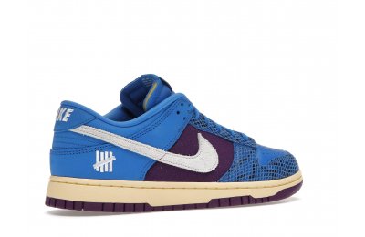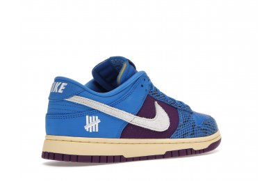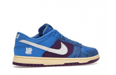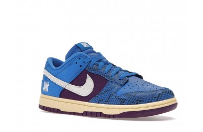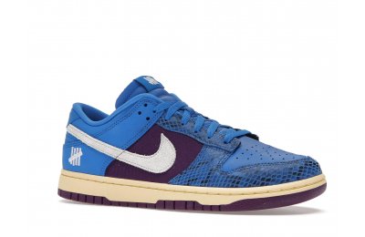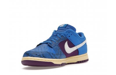 The Nike Dunk Low Undefeated 5 On It features a blue leather upper with snake print overlays, purple canvas quarter panels, and white suede Swooshes. From there, Undefeated logos on the heel and woven tongue label complete the design.