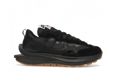 The Nike Vaporwaffle sacai Black Gum features a black nylon upper with matching monochromatic suede overlays and tumbled leather Swooshes. Doubled tongues and Swooshes continue sacai's aesthetic of reconstruction and abstraction. At the base, a stacked foam midsole atop a gum outsole adds the finishing touch.