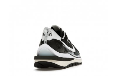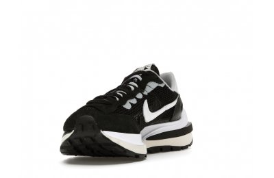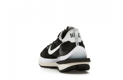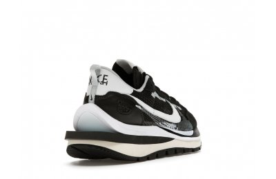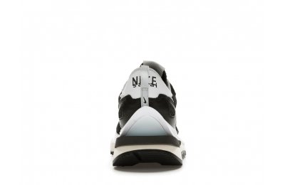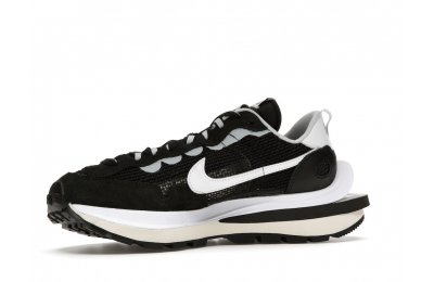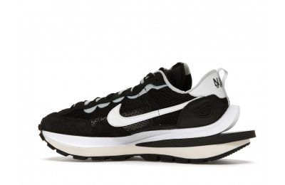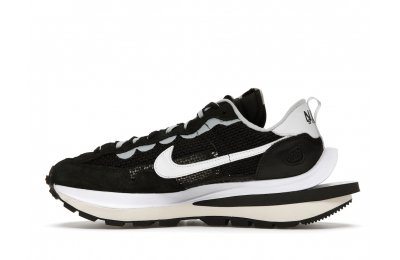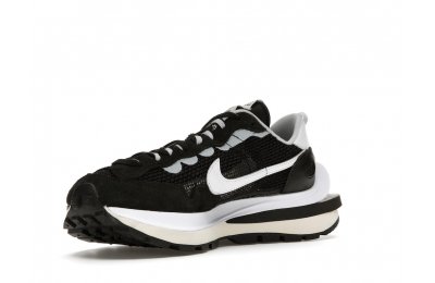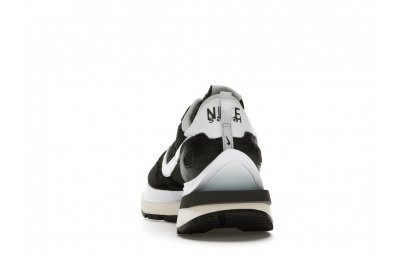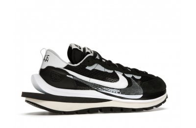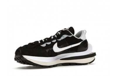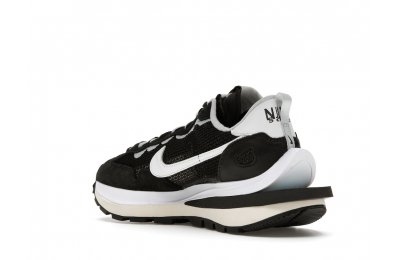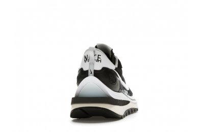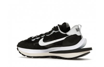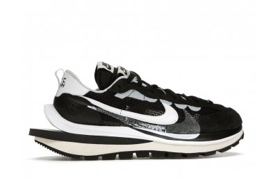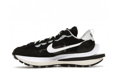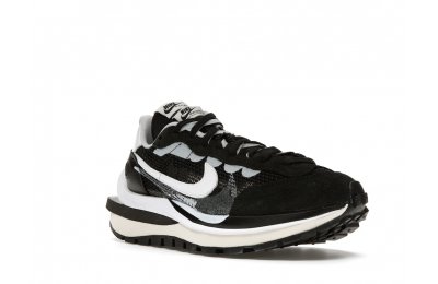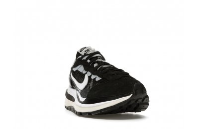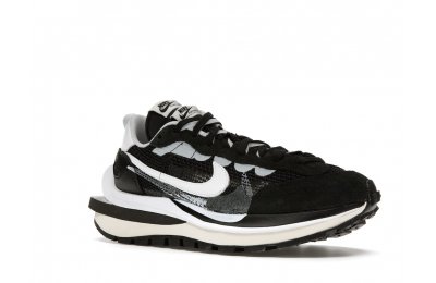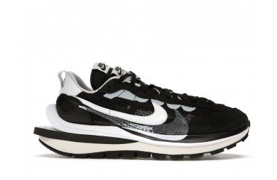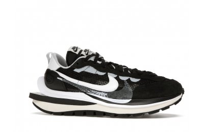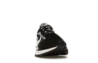 The Nike Sacai Vaporwaffle Black / White takes cues from the Swoosh’s original Waffle sole and flips it on its head by adding a thicker, stacked midsole that peeks out from the heel. Next, the upper shares similarities with the Nike Cortez, but swaps out the traditional leather with black suede and mesh to its entirety for breathability. Just like their past projects with Nike, Sacai adds both a second Swoosh in white and tongue to the sneaker, continuing their layered motif.