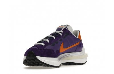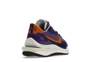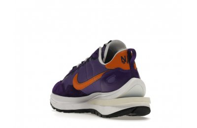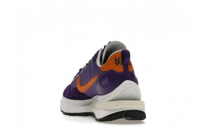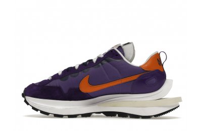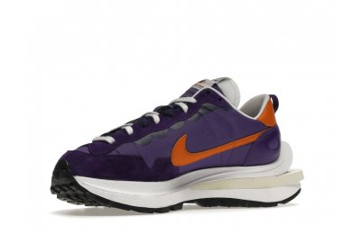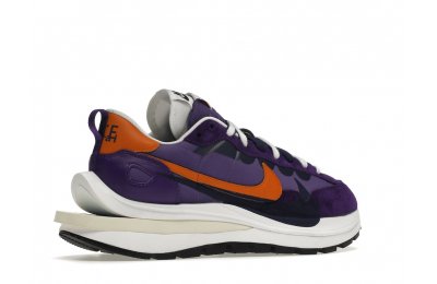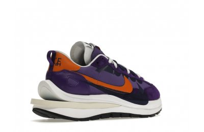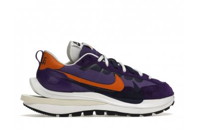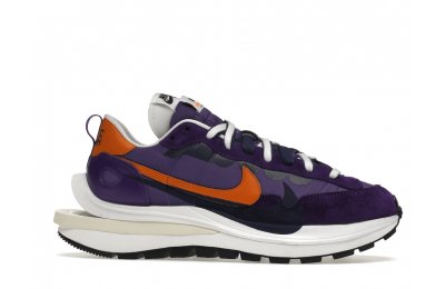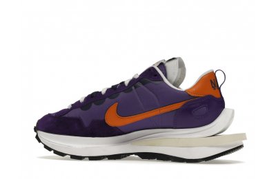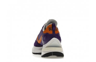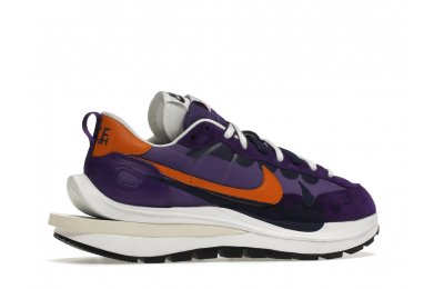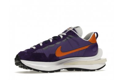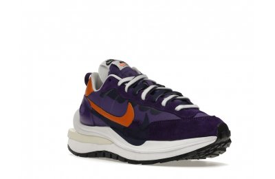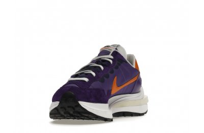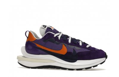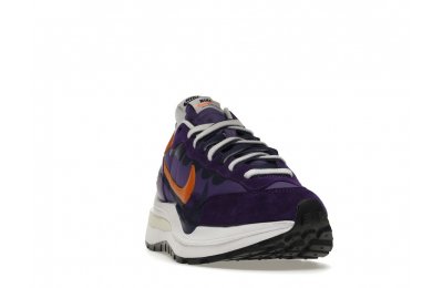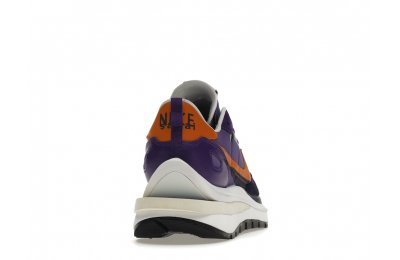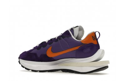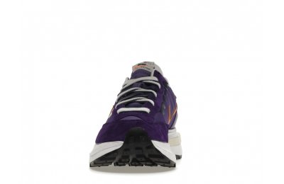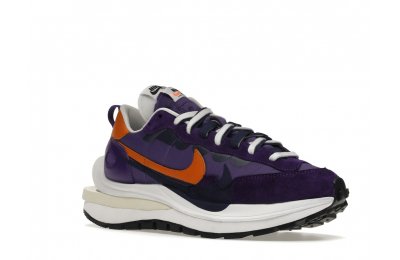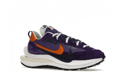 The Nike VaporWaffle sacai Dark Iris is composed of a Dark Iris suede, leather, and textile upper with hits of orange on the Swoosh and heel wrap. The tongues, Swooshes, and white midsoles are doubled similar to previous collaborative Waffle releases. Nike and sacai branding is located on the woven tongue labels and heel tabs. A black Waffle outsole adds the finishing touches to the design.