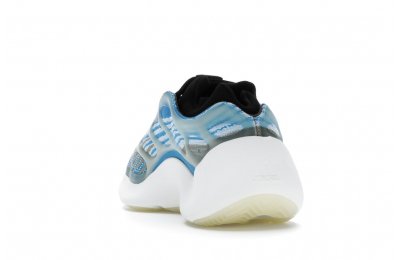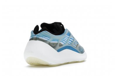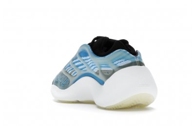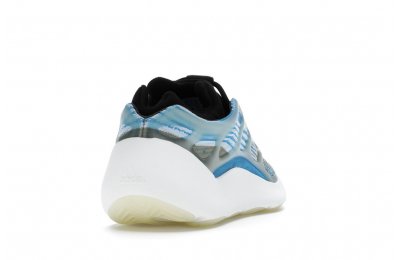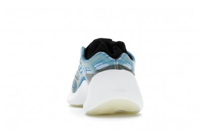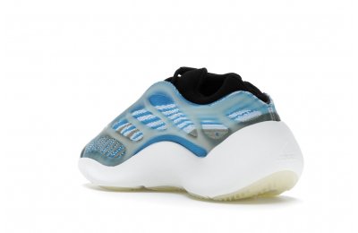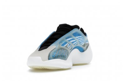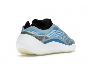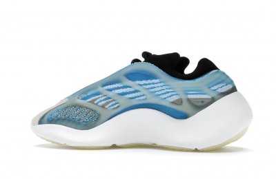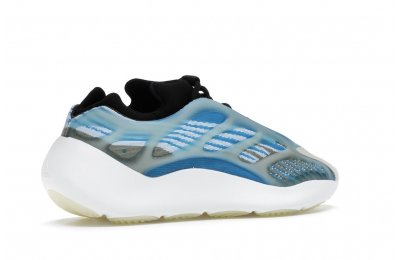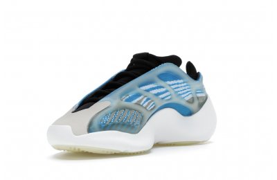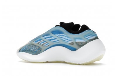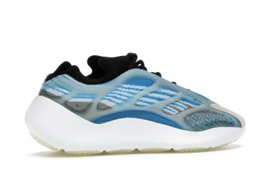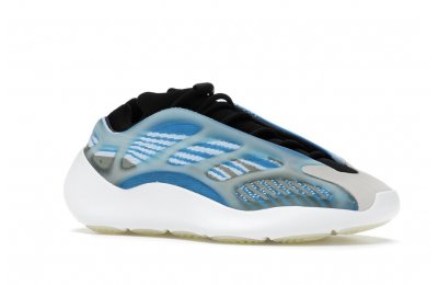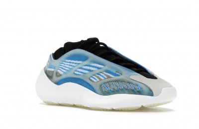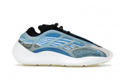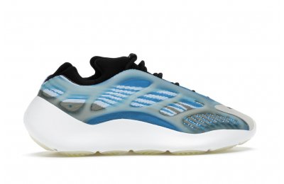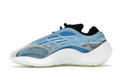 The Yeezy 700 V3 Arzareth features a blue and grey Primeknit upper that is complemented by a traditional translucent glow-in-the-dark cage overlay. From there, an EVA foam midsole, grey toe cap, and black lining complete the design.